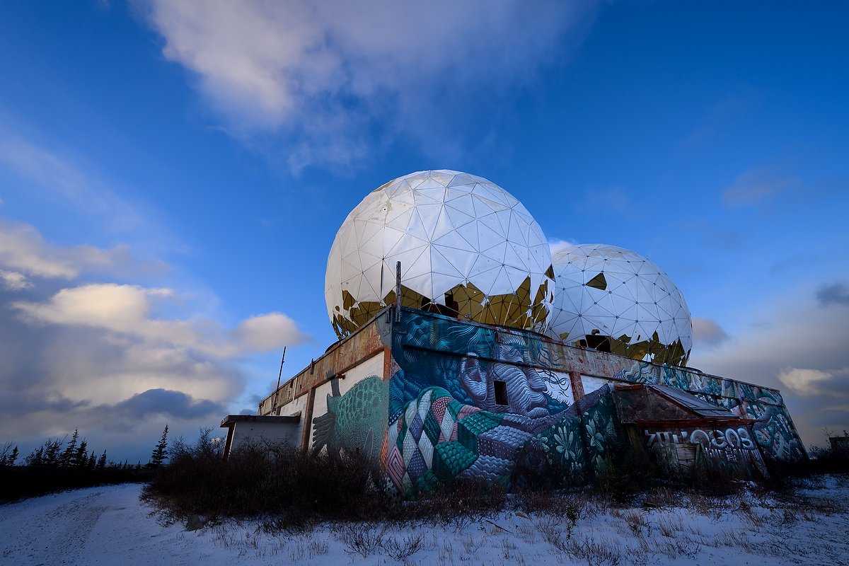 Just outside of Churchill is an old rocket launch area, now abandoned. These radar domes were part of the facility. Over the years, artists have visited Churchill to paint murals on many of the buildings. Nikon Z8, Aperture Priority, white balance, ISO 200, 1/100 at f/10 in Matrix metering, -0.3 EV, Nikkor Z 14-30mm f/4 S lens at 14mm.