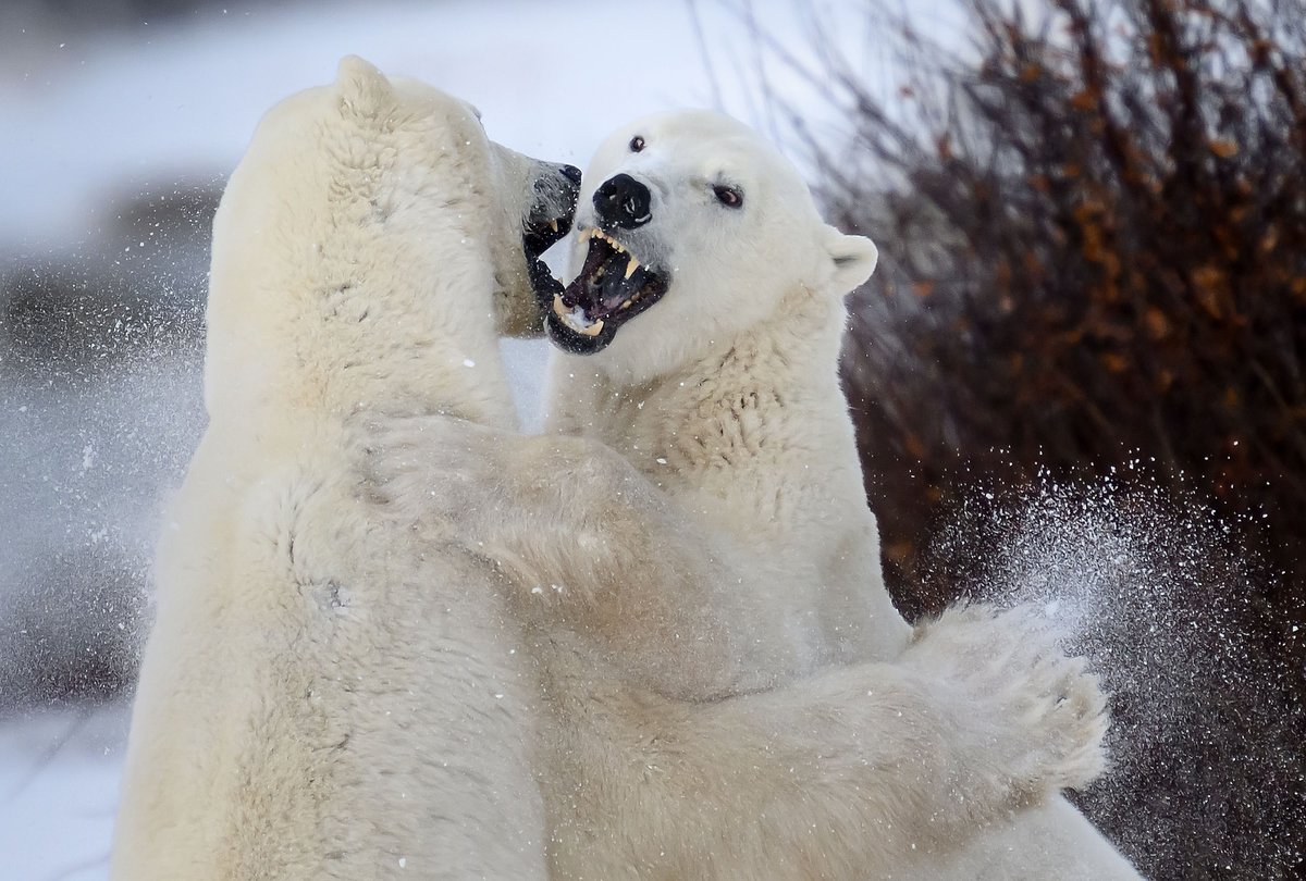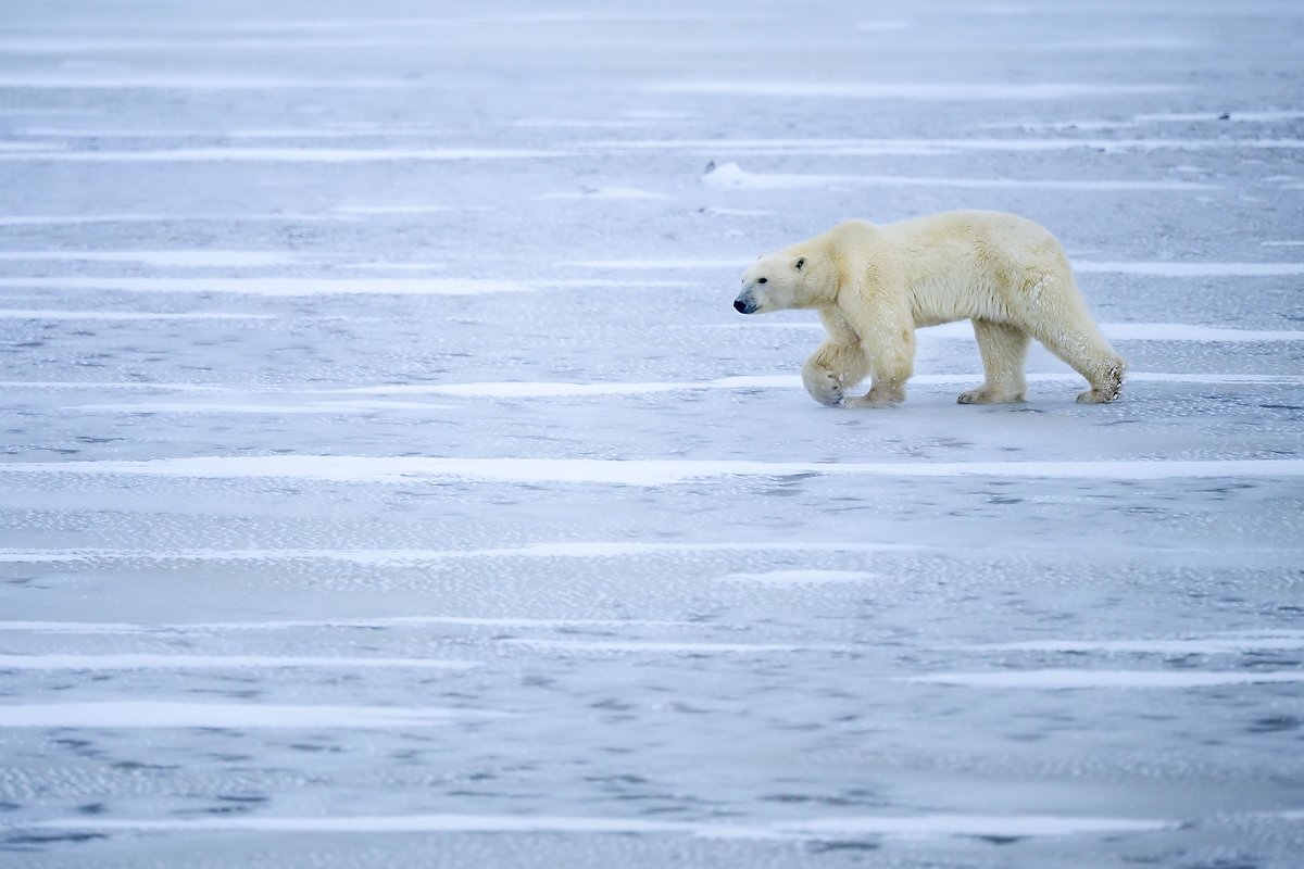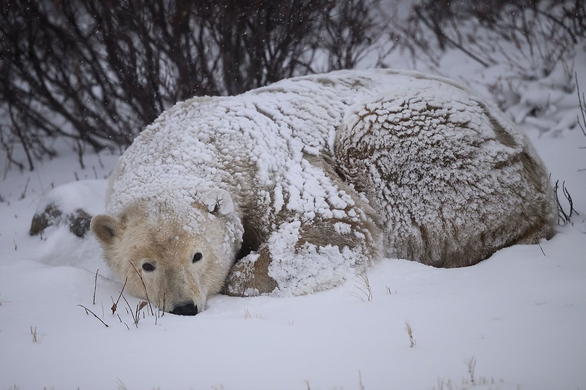The west side of Hudson Bay, at the mouth of the Churchill River, is one of the first places in the region where ice begins to form in the fall. Polar bears subsist mainly on seal, which they can only hunt on the ice. They spend the summers in a state of “walking hibernation,” not sleeping, living off what they’ve eaten the previous winter. Come fall, as they sense the ice about to form, they gather around Churchill and wait.