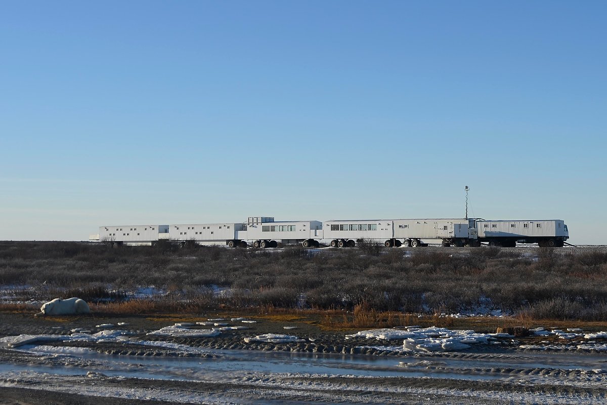 The Tundra Buggy Lodge. The two cars at far left are the sleeping cars, then the lounge car (with a small platform on top for viewing) and the dining car. At the end is staff quarters. Nikon Z6III, Aperture Priority, Auto white balance, ISO 125, 1/320 at f/7.1 in Matrix average metering, +0.7 EV, Nikkor Z 28-400mm f/4-8 VR lens at 41mm.