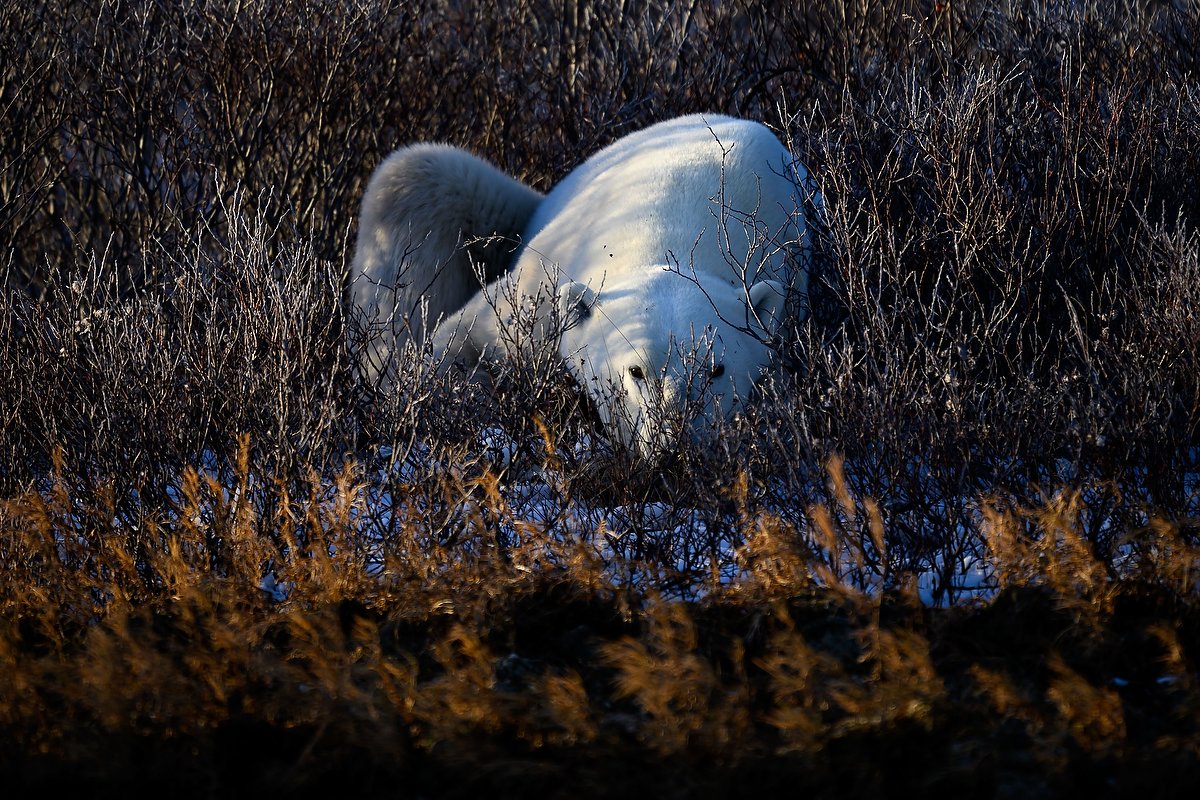 The morning of our third day on the tundra began with beautiful, warm light. Unfortunately, it clouded over in about thirty minutes. Fortunately, there was a bear nearby. Nikon Z8, Manual exposure with Auto ISO, Sunny white balance, ISO 450, 1/1000 at f/4 in Matrix metering, 0.0 EV, Nikkor Z 400mm f/2.8 TC VR lens with built-in 1.4X teleconverter for 560mm.