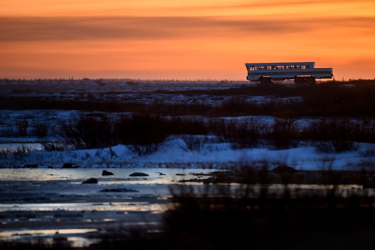There are a few different ways to visit Churchill and see polar bears. Our group used Frontiers North, the inventors of the “Tundra Buggy” nearly 50 years ago. Their trips start and end in Winnipeg, and range from one to six days, with prices from around $1,000 to over $13,000. All those trips include transportation from Winnipeg to Churchill, either by train or charter flight. While the fall trips all offer polar bear viewing, they do vary in what else you see and do while there. On our first afternoon after landing in Churchill, we toured the town and surrounding area. At dusk we transferred to a tundra buggy for the drive out to Polar Bear Point and the “Tundra Buggy Lodge.”