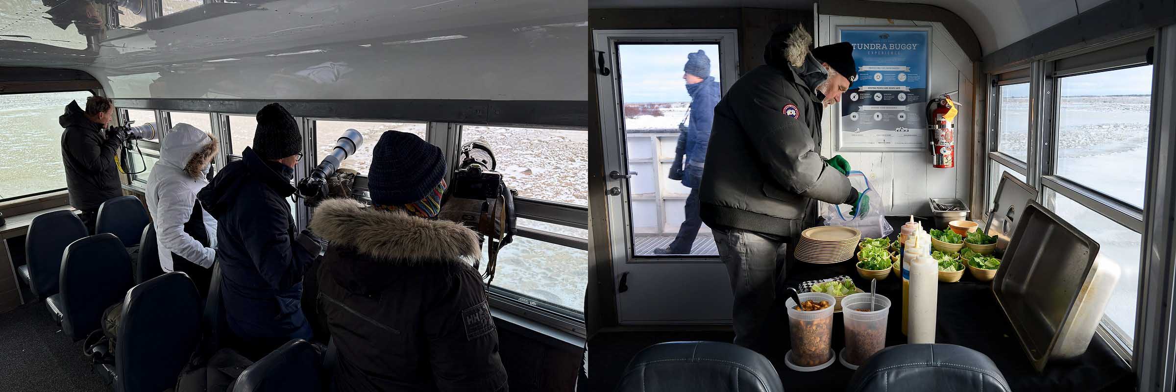 This is what it’s like inside the tundra buggy. With the brutal wind, we worked mostly from inside, shooting out the windows. On the right is our driver, “Buggy Bob,” preparing lunch as we photograph a bear. iPhone photos.