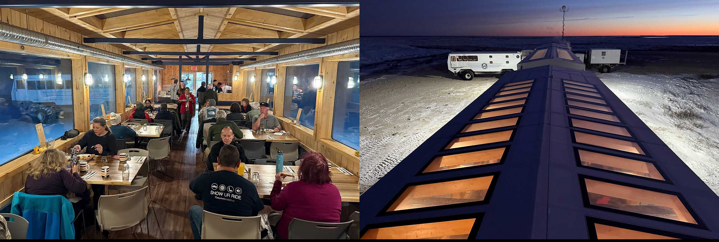 The photo at left shows the dining car, and the one at right is from on top of the viewing platform, with the lounge car’s skylights in the foreground. At back left, you can see how a tundra buggy docks to the lodge by backing in to connect its rear deck with the other car. iPhone photos.