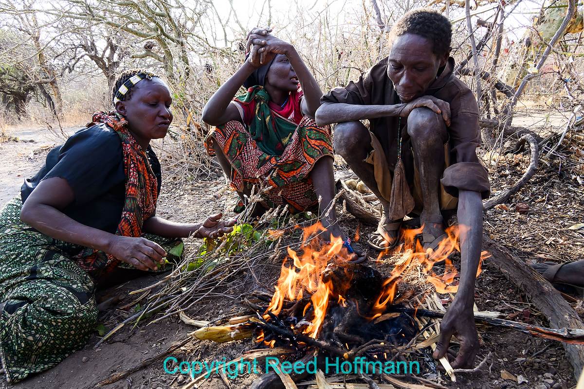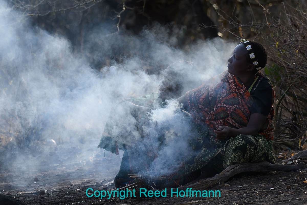 One of the Hadzambe women building a fire. Nikon Z 8, Manual exposure with Auto ISO, Sunny white balance, ISO 280, 1/400 at f/6.3 in Matrix metering, -0.3 EV, Nikkor Z 24-200mm f/4-6.3 VR lens at 200mm.