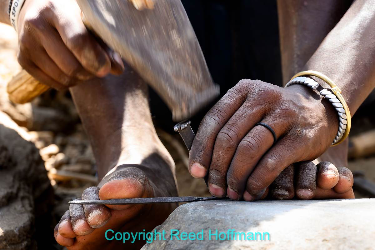 Using his feet to hold it in place, one of the men fashions barbs in the side of an arrowhead, to prevent it from falling out of an animal once shot. Nikon Z 8, Manual exposure with Auto ISO, Sunny white balance, ISO 2200, 1/200 at f/9 in Matrix metering, +0.3 EV, Nikkor Z 24-200mm f/4-6.3 VR lens at 200mm.