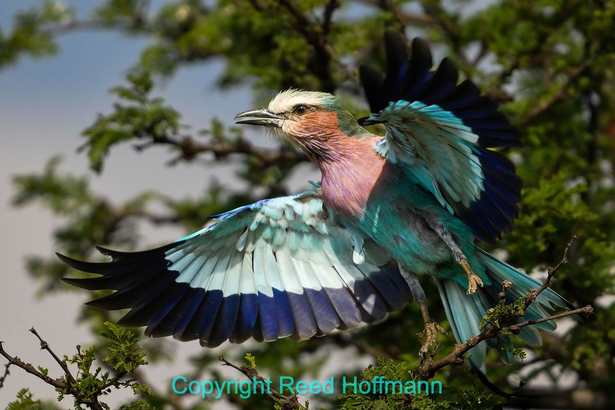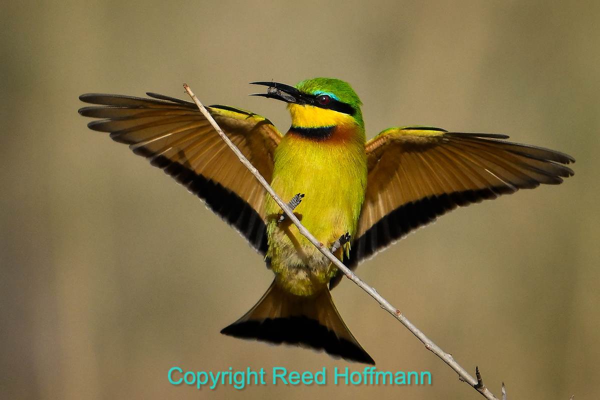 A bee-eater lands with a bug it just caught for breakfast. These birds are tiny, so while driving, our guides are on the lookout for ones near the road, in good light, like this one. Nikon Z 8, Manual exposure with Auto ISO, Sunny white balance, ISO 900, 1/5000 at f/6.3 in Matrix metering, 0.0 EV, Nikkor Z 180-600mm f/5.6-6.3 VR lens at 600mm.