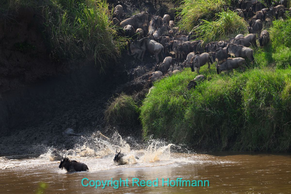 Wildebeest jump into the Mara River to cross. Nikon Z 8, Manual exposure with Auto ISO, Sunny white balance, ISO 800, 1/2000 at f/5.6 in Matrix metering, -0.7 EV, Nikkor Z 180-600mm f/5.6-6.3 VR lens at 270mm.