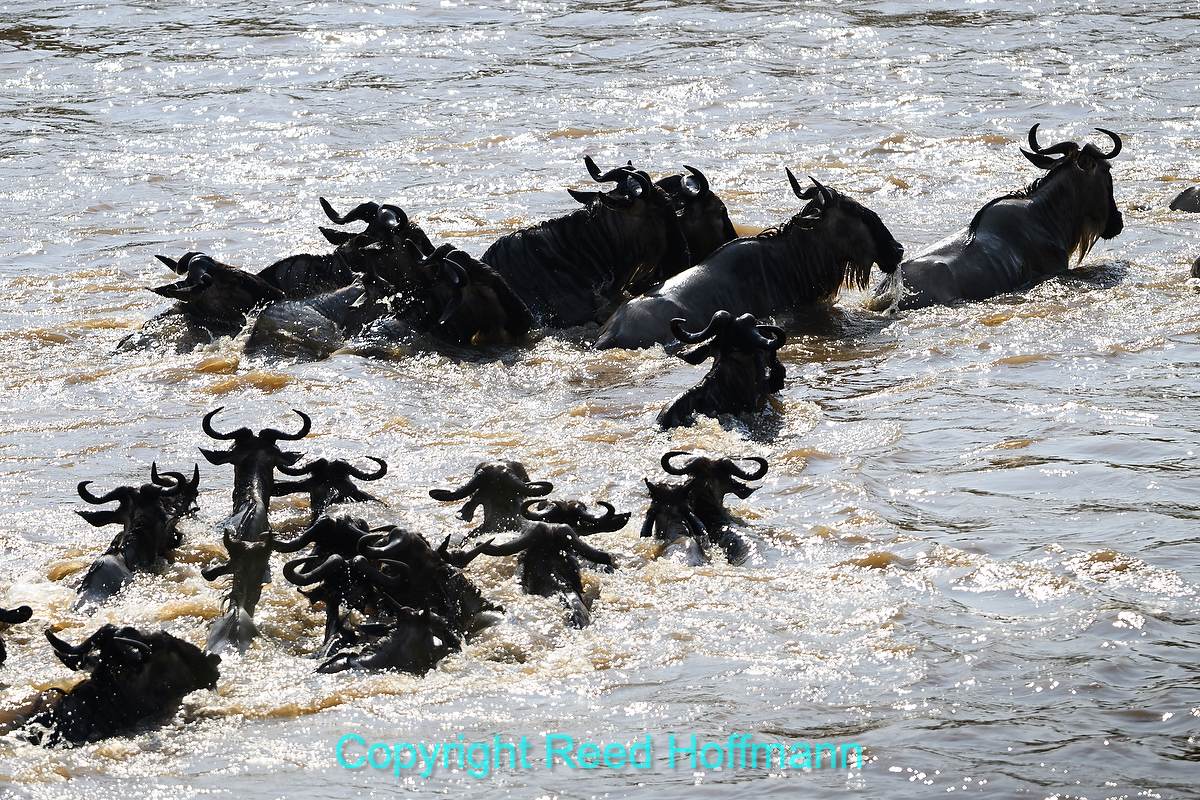 A group of wildebeest making the swim across the Mara River. Nikon Z 8, Manual exposure with Auto ISO, Sunny white balance, ISO 110, 1/1600 at f/6 in Matrix metering, -0.3 EV, Nikkor Z 180-600mm f/5.6-6.3 VR lens at 350mm.