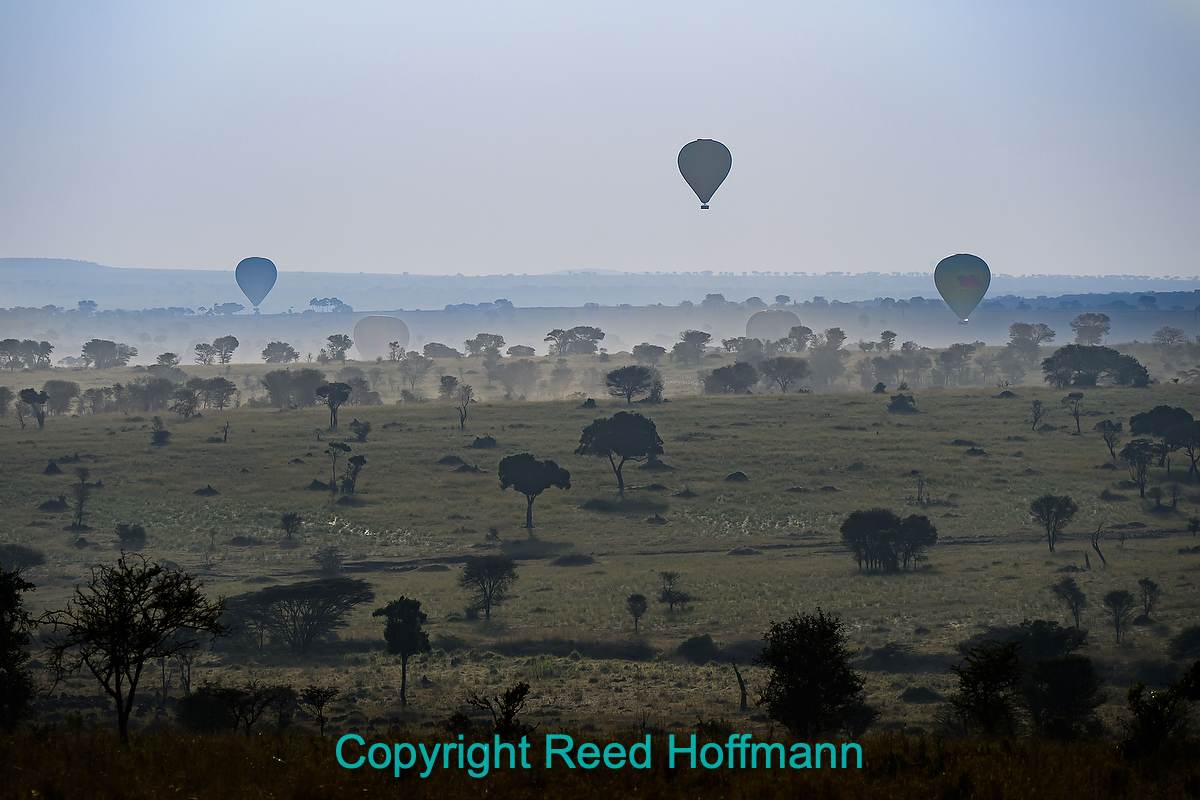 Sightseeing alloons rise from the savanna near the river at sunrise. Nikon Z6III, Manual exposure with Auto ISO, Sunny white balance, ISO 160, 1/2000 at f/7.1 in Matrix metering, 0.0 EV, Nikkor Z 24-200mm f/4-6.3 VR lens at 200mm.