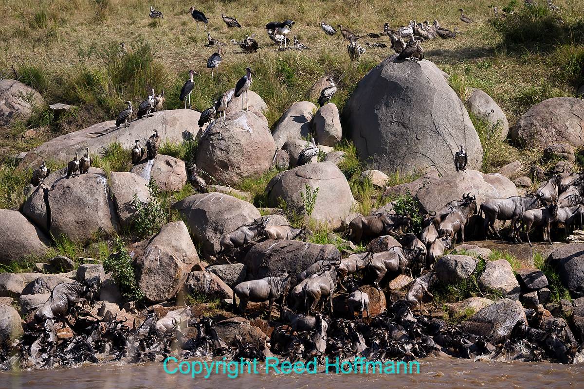 Dozens of vultures watch, and wait, as the wildebeest cross the Mara River. Nikon Z 8, Manual exposure with Auto ISO, Sunny white balance, ISO 500, 1/2000 at f/6.3 in Matrix metering, -0.3 EV, Nikkor Z 180-600mm f/5.6-6.3 VR lens at 220mm.