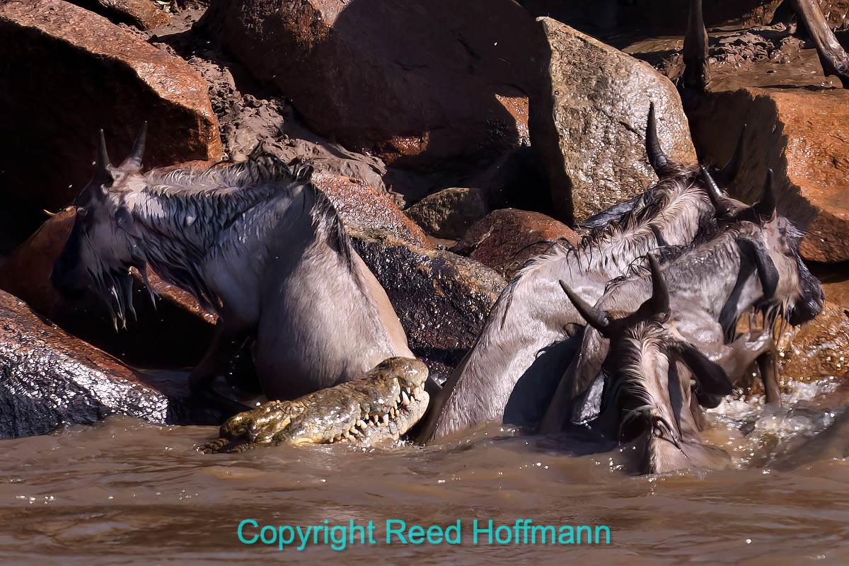 We saw one crocodile make a half-hearted attempt to grab a wildebeest as they climbed out of the river. Most crocodiles simply wait for animals to drown, then feast on the remains. Nikon Z 8, Manual exposure with Auto ISO, Sunny white balance, ISO 1000, 1/2500 at f/6.3 in Matrix metering, -0.3 EV, Nikkor Z 180-600mm f/5.6-6.3 VR lens at 600mm.