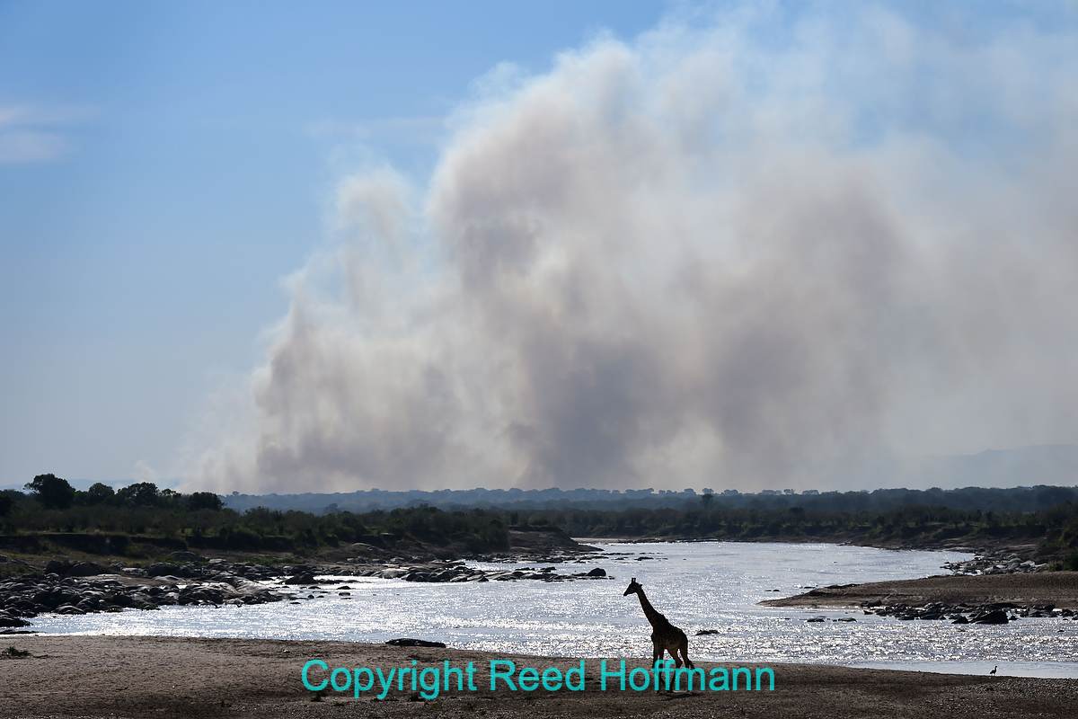Smoke from distant fires are seen on the horizon, as a giraffe crosses the river. Sections of the Serengeti are burned every year to promote fresh growth and control invasive species. Nikon Z6III, Manual exposure with Auto ISO, Sunny white balance, ISO 100, 1/1000 at f/8 in Matrix metering, +1.0 EV, Nikkor Z 24-200mm f/4-6.3 VR lens at 99mm.