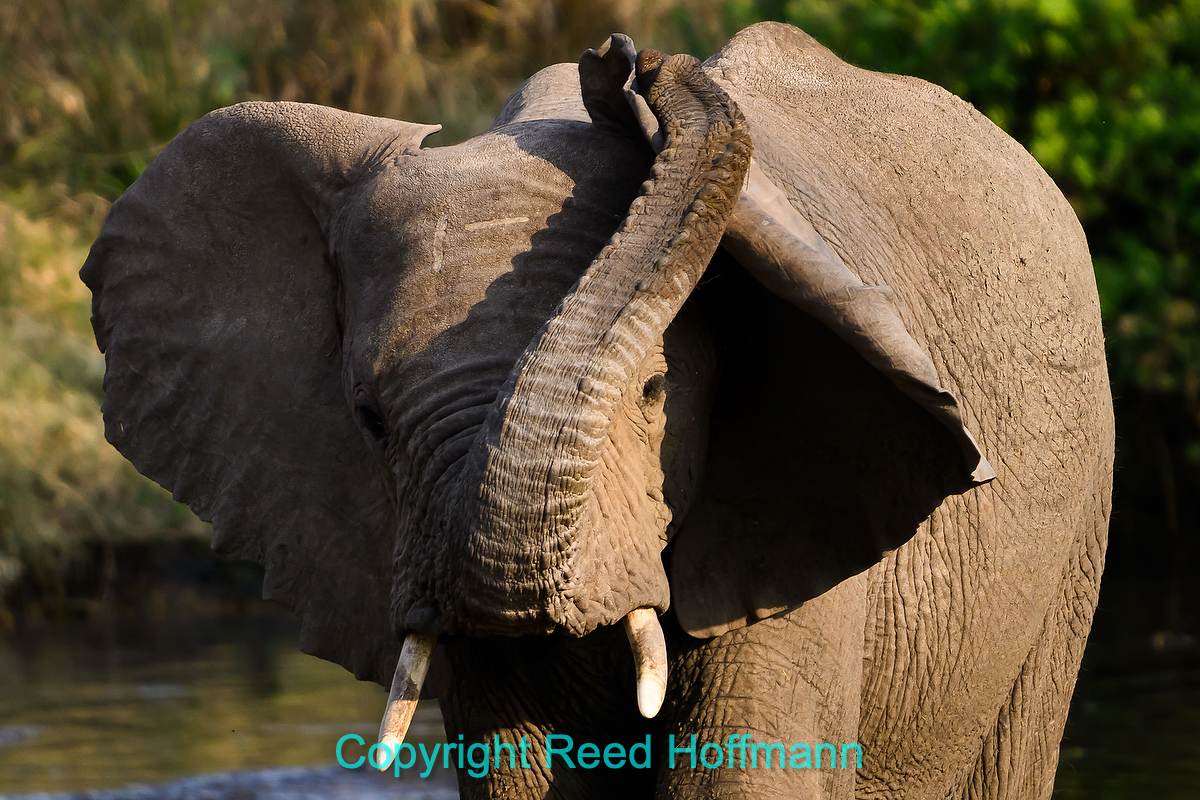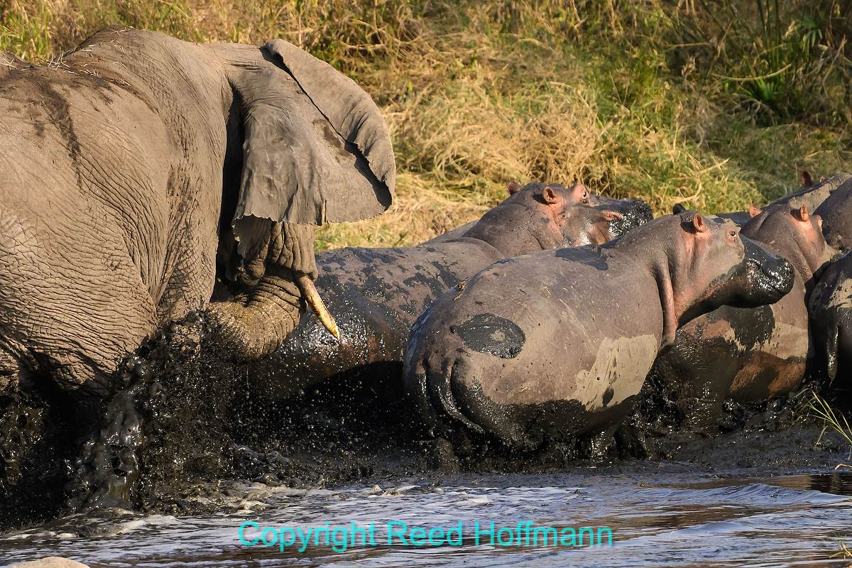 Elephants have poor eyesight, so they’ll often chase off anything they sense is near them since they’re not sure if it’s dangerous or not. While a grown elephant doesn’t have any natural enemies, they often have babies with them and are very protective of the little ones. In this case, this elephant chased off a group of hippos lounging in the river. Grown hippos don’t have any natural enemies either, but prefer not to get poked by tusks! Nikon Z 8, Manual exposure with Auto ISO, Sunny white balance, ISO 2000, 1/1250 at f/10 in Matrix metering, 0.0 EV, Nikkor Z 180-600mm f/5.6-6.3 VR Z lens with TC-1.4x teleconverter for 840mm.